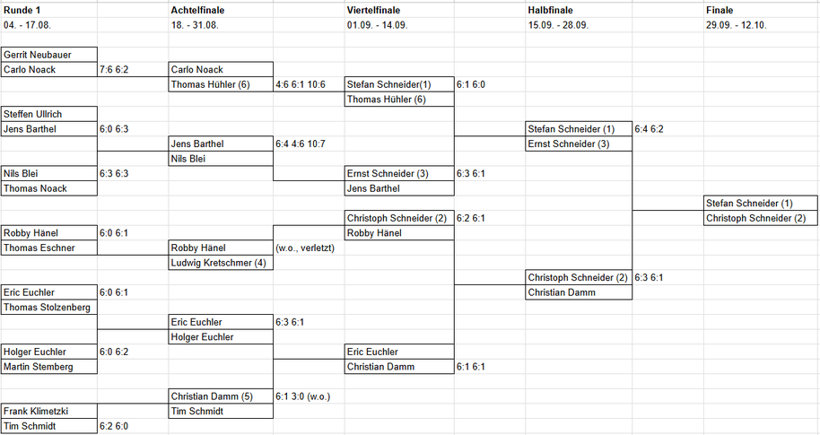Anstatt eines zentralen Termins an dem dann doch oft ein größerer Teil verhindert ist, geben wir lediglich einen zeitlichen Rahmen vor, in dem ein Spiel stattfinden muss, sodass sich dann die Clubmeisterschaft über ca. 2 Monate verteilt. Aktueller Clubmeister bei den Herren ist seit ca. 6 Jahren Christoph Schneider, wenn die Informationen stimmen.