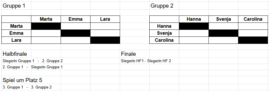 Wir arbeiten dieses Jahr mit einem Turnierbaum der etwas anders ist, als ihr ihn vielleicht kennt. Um die Partien interessant zu halten, steigen manche Spieler erst später in das Turniergeschehen ein. Die Setzung erfolgt nach bestem Wissen und Gewissen durch Eric & Konrad.